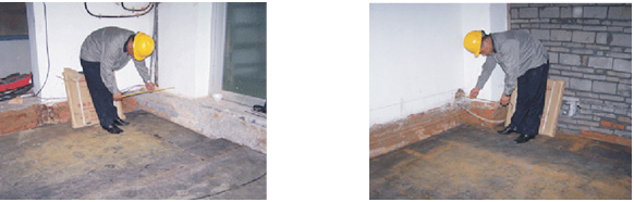 3、选一个墙角作为出发点,在墙面上找好水平,按照墙面水平需要高度,距墙面595mm处拴两条平行墙面的腊线,此腊线不易断裂和延伸,两条必须垂直分布。