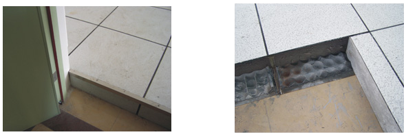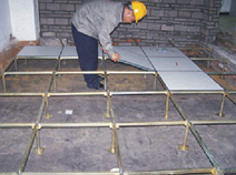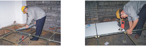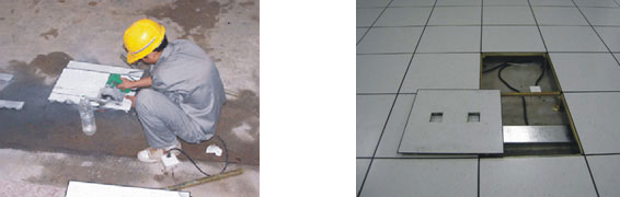 9、防静电地板收边,在墙边或门框、柱子处,视实际尺寸以电锯切割主板,或安装适当的收边零件。封门用不锈钢或角铝(直角型)以玻璃胶粘合或拉钉紧固。